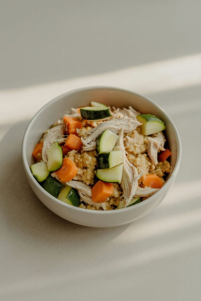 Oatmeal is gentle, slow-digesting, and excellent for bowel regularity. Chicken offers lean protein, while vegetables provide essential vitamins without overloading the meal.