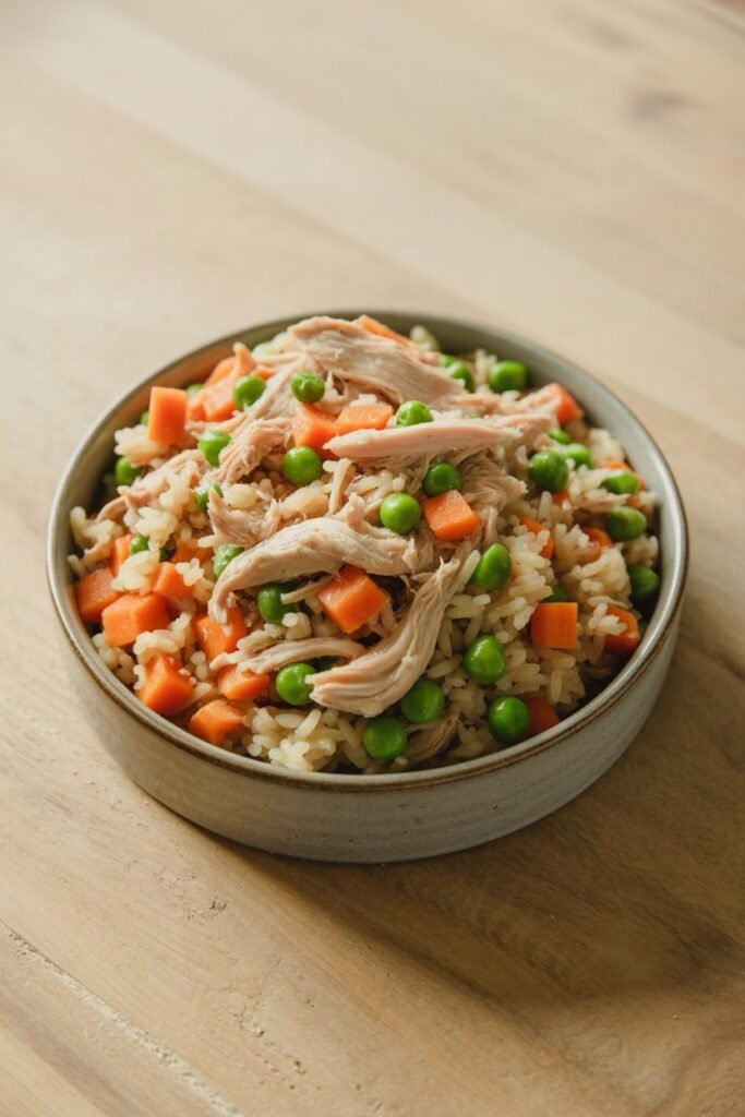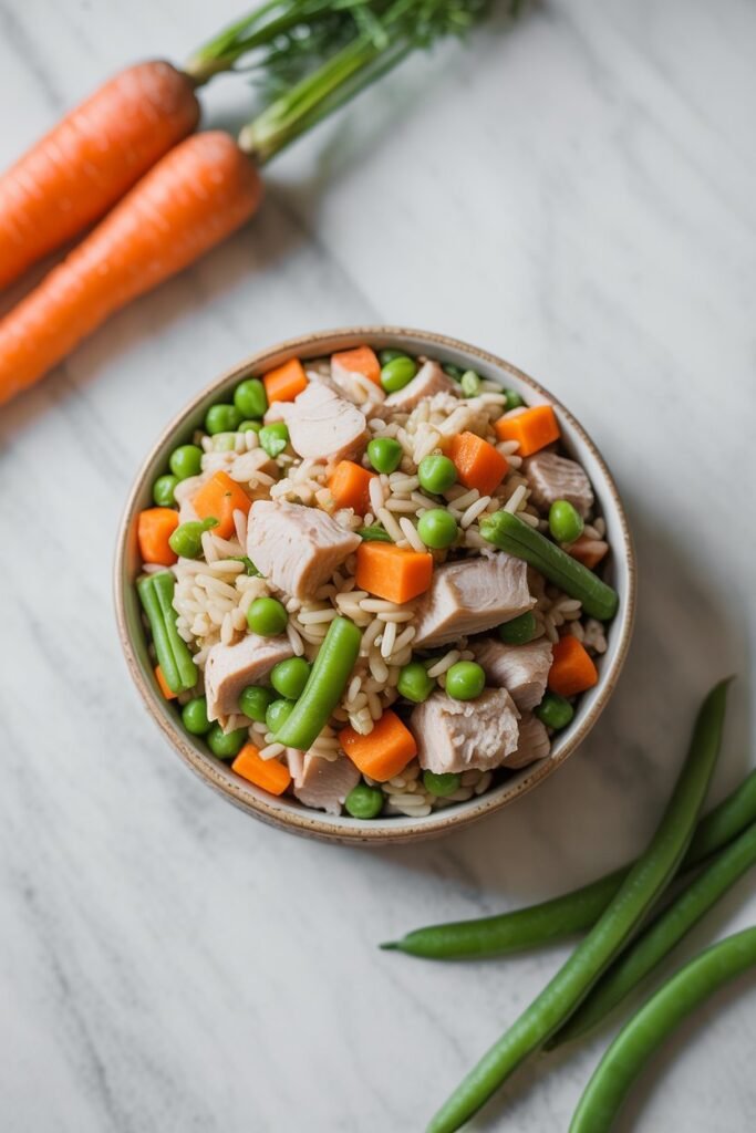 Chicken provides lean, highly digestible protein. Rice offers gentle carbohydrates that support energy without overwhelming the digestive system. The vegetables supply essential micronutrients and fiber.