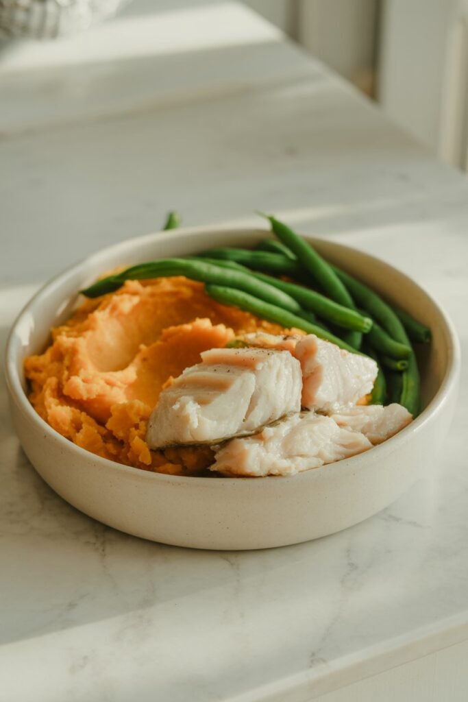 White fish is low in fat and highly digestible. Sweet potatoes provide fiber and vitamin A without triggering common food sensitivities.
