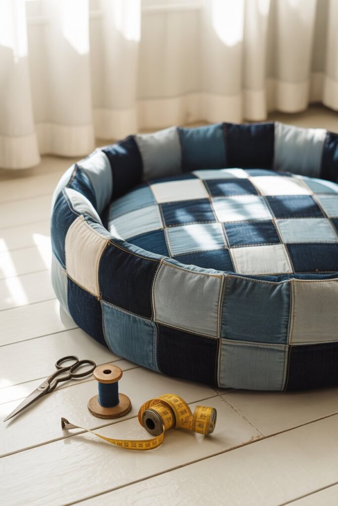 Cut denim into equal panels, stitch them together, and leave an opening. Fill with soft stuffing, then sew it closed. The result: a durable, washable, and stylish dog bed.