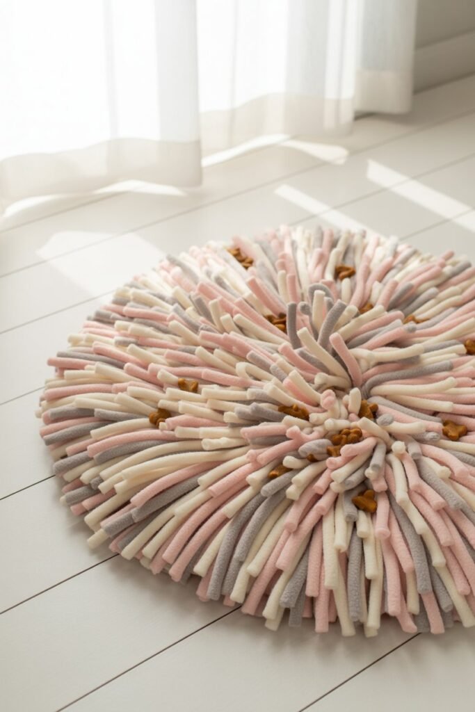 Thread each fleece strip through the mat’s holes and tie securely. Continue until the surface is full and fluffy. Sprinkle kibble or treats into the folds, and let your dog sniff them out.