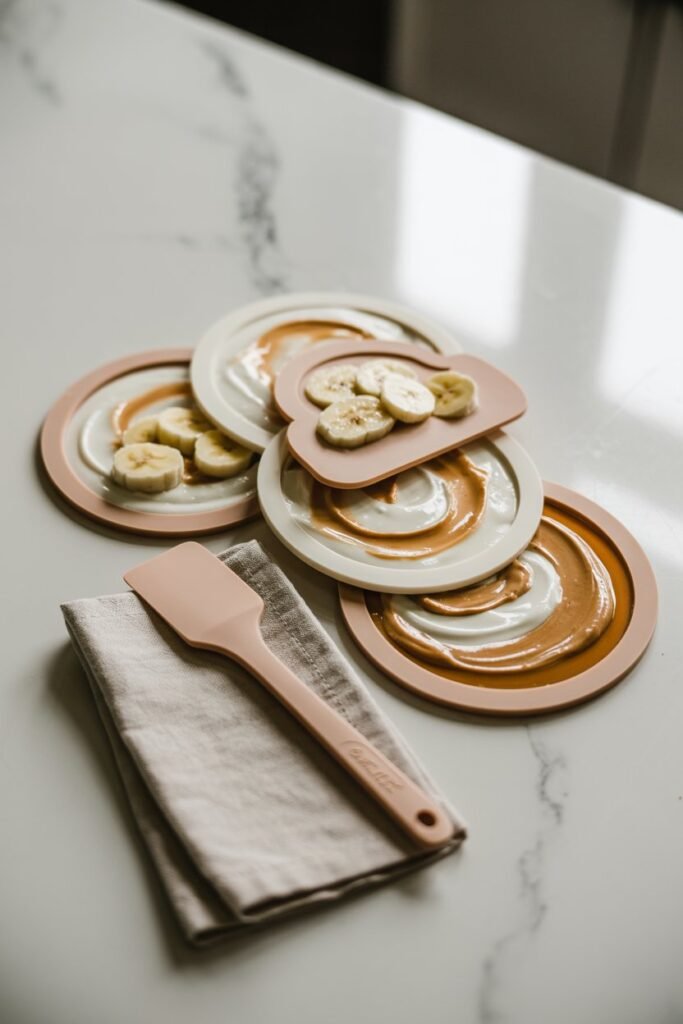 Spread a base layer of yogurt or banana over the lick mat, smoothing it into all the grooves. Add a second layer with peanut butter or broth for flavor variety. Freeze for 1–2 hours.