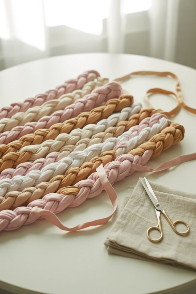 Cut your T-shirts into long, even strips around 2 inches wide. Gather three strips, knot them together at one end, then braid them tightly. Once you reach the end, tie another strong knot. For a chunkier toy, braid multiple sets together.