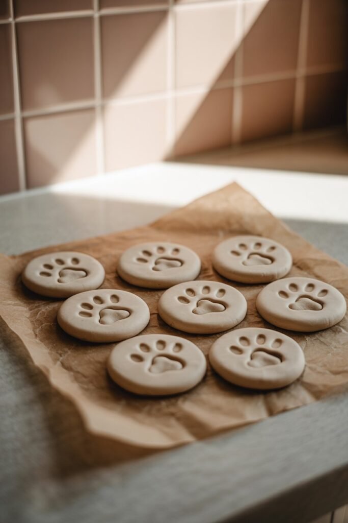 Mix flour, salt, and water into a soft dough. Roll it out and press your dog’s paw gently into the surface. Cut into a circle, then bake at 200°F (93°C) for 2–3 hours until hardened. Once cool, paint and label it.