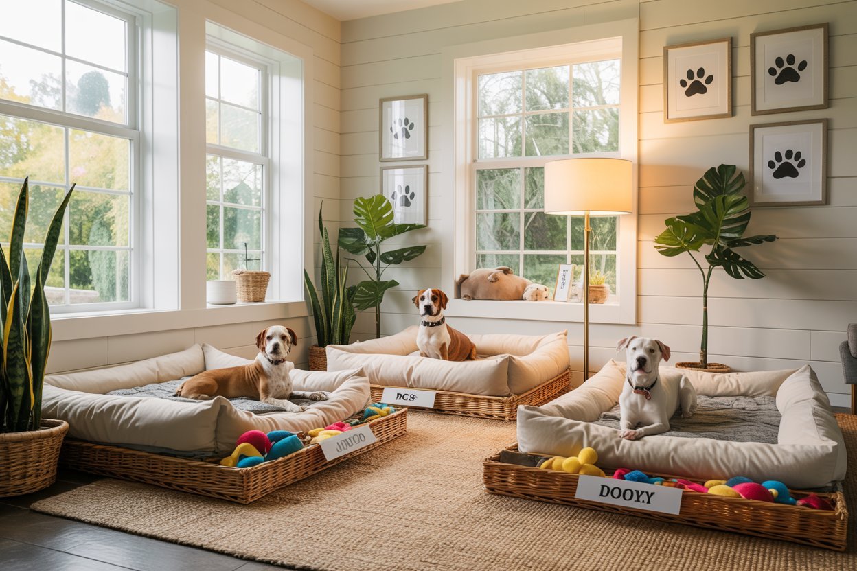 I positioned each dog’s bed in different corners of the room so they all had their personal “territory,” then used the middle area as shared play space. Keeping things balanced helped reduce squabbles over toys and gave everyone a bit of privacy.