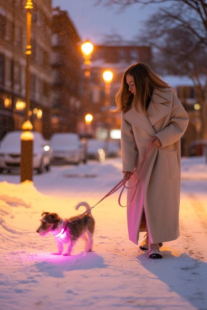 I learned the importance of visibility during our first winter evening walk. It gets dark so early, and even with streetlights, it can be hard for drivers or bikers to spot small dogs.