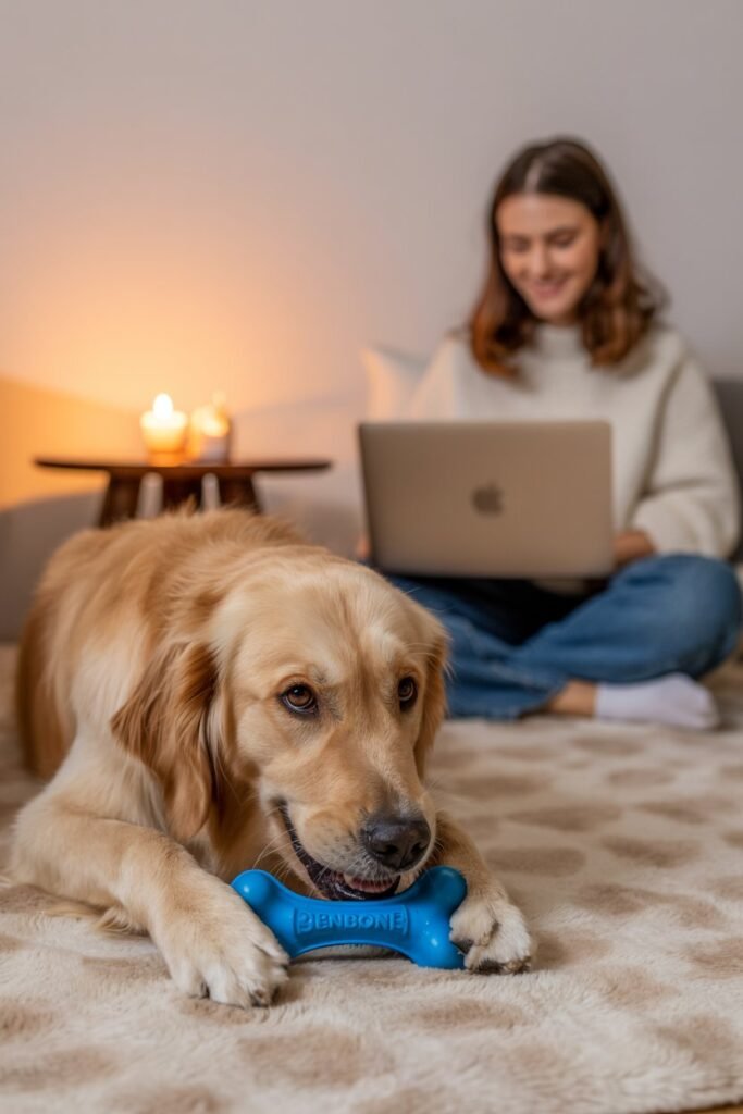 When outdoor time is limited, chewing becomes my dog’s go-to stress reliever. The Benebone Wishbone Chew smells like real bacon (and apparently tastes amazing, judging by her enthusiasm).