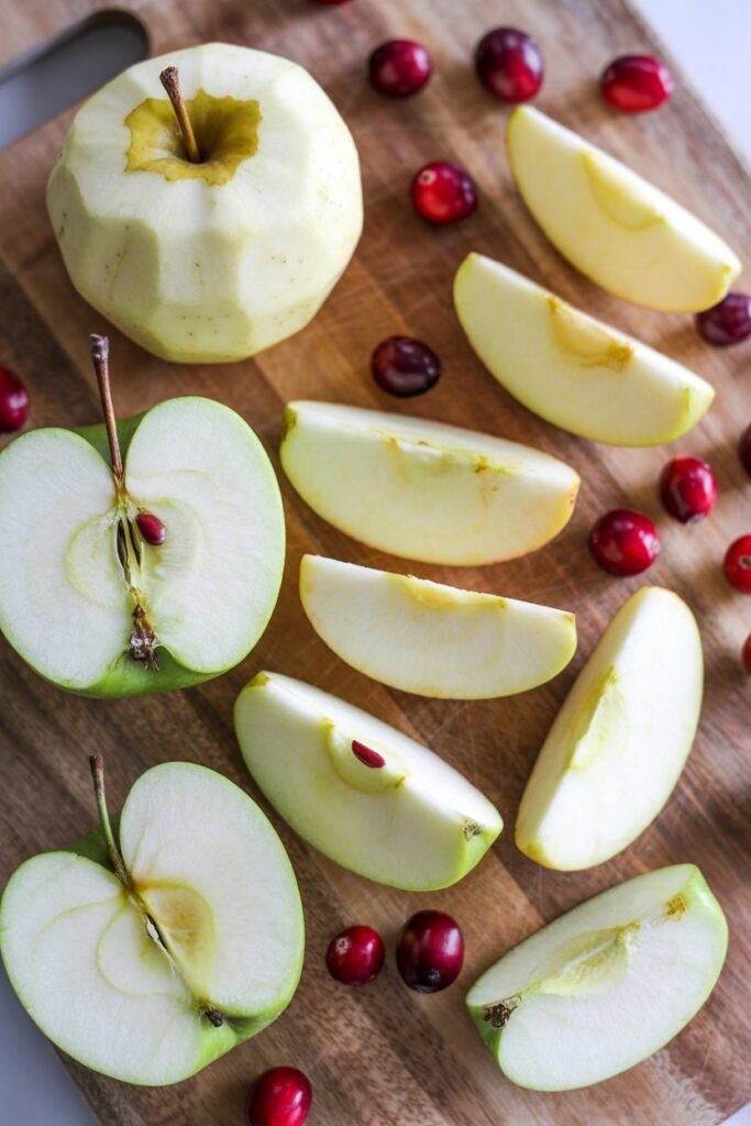 I peel and core the apple, then grate it finely. Cranberries are chopped small to prevent pockets of moisture.