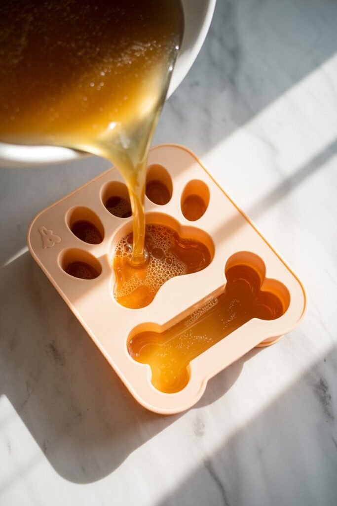 Carefully pour the liquid mixture into silicone molds shaped like paws, bones, or hearts.