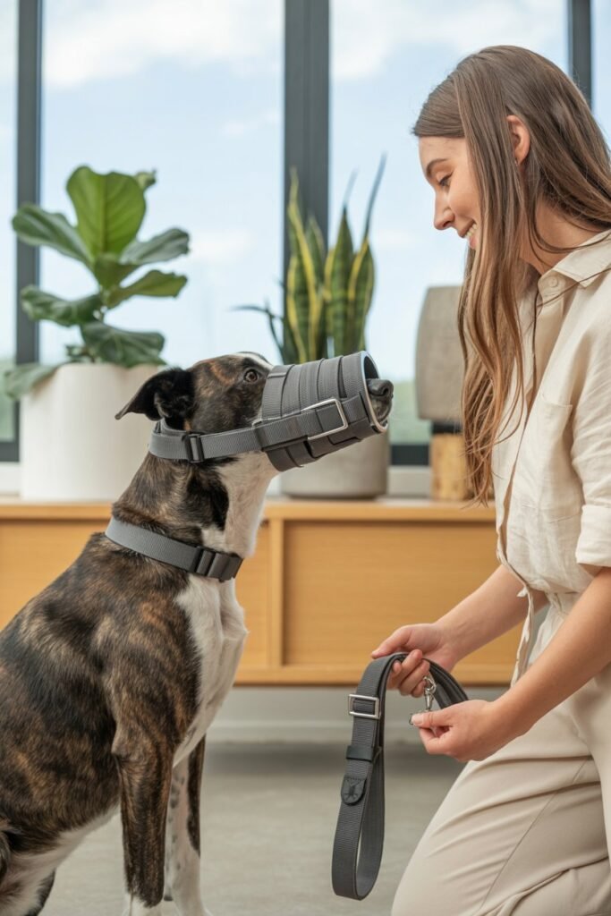 “Introduce the muzzle slowly. Let your dog sniff it, reward with treats, and build positive associations.”