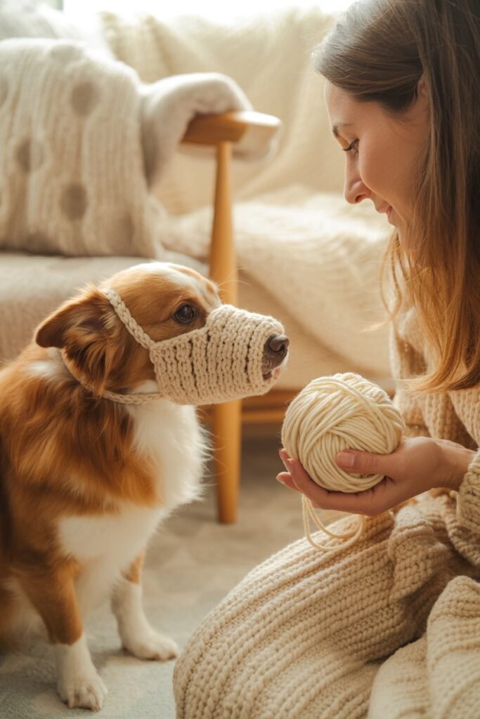 If you crochet, this one’s both adorable and clever. Using sturdy cotton yarn, make a rounded muzzle cup that ties gently behind the ears.