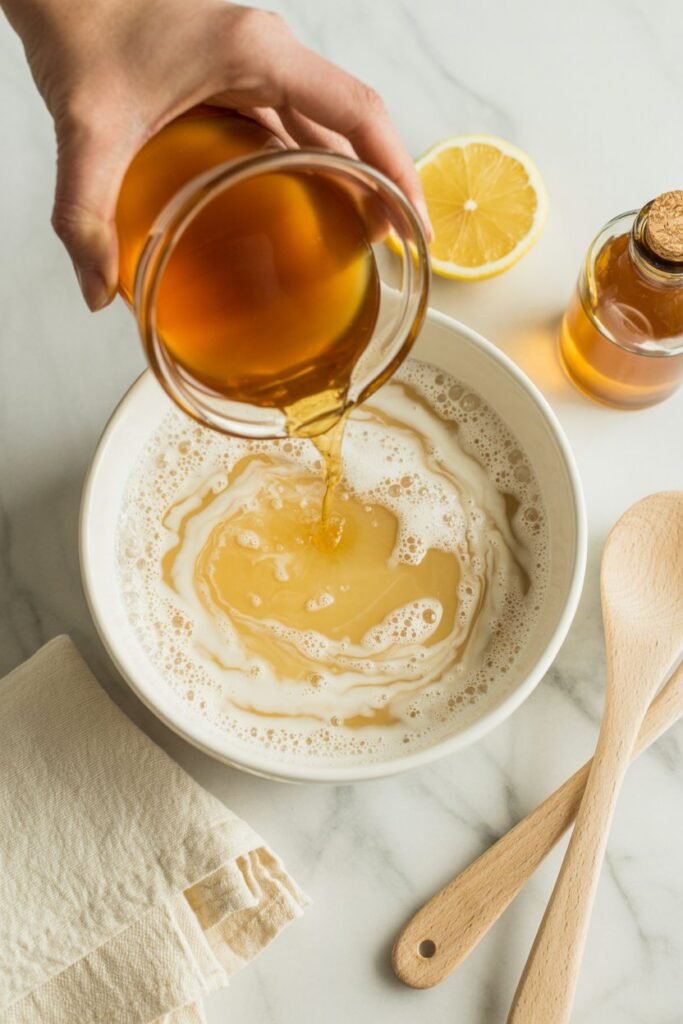 Now add your apple cider vinegar and lemon juice. These are your natural flea repellents — their acidic properties help weaken fleas’ grip and make your dog’s skin less appealing to them.