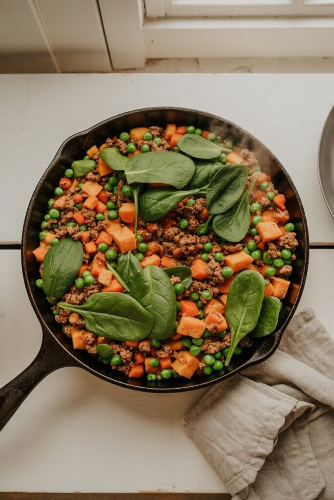 Add the chopped veggies and diced sweet potatoes to the skillet. Pour in the bone broth or water, then cover and let it simmer for about 10 minutes, until the vegetables are tender.