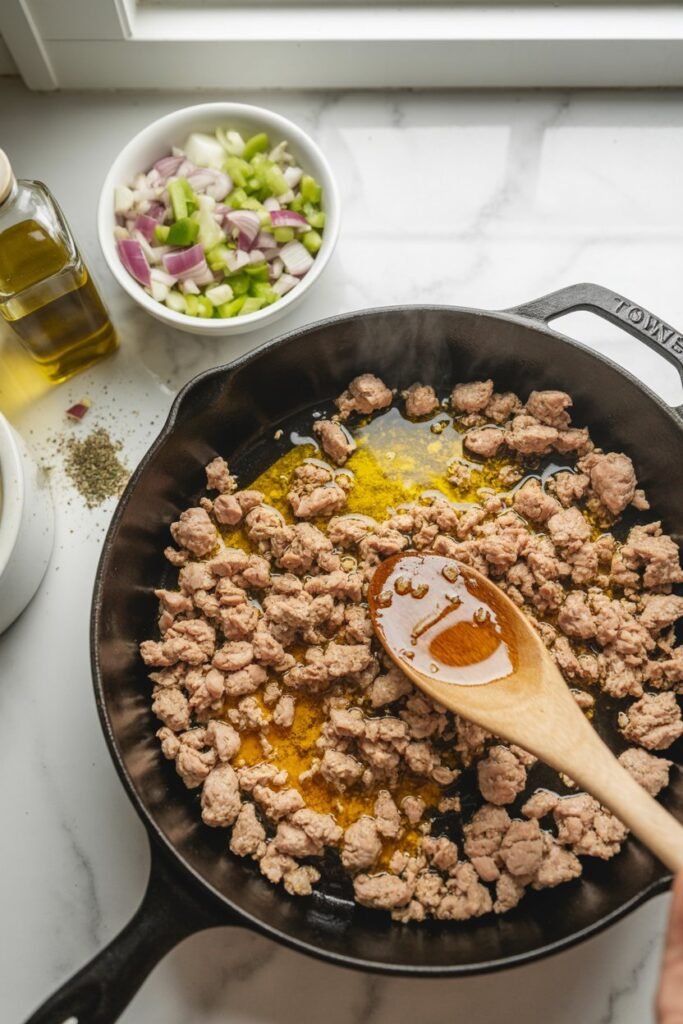 In a large skillet, heat the olive oil over medium heat. Add the ground turkey (or your chosen protein) and cook until no longer pink. Use a wooden spoon to break up the meat as it cooks.