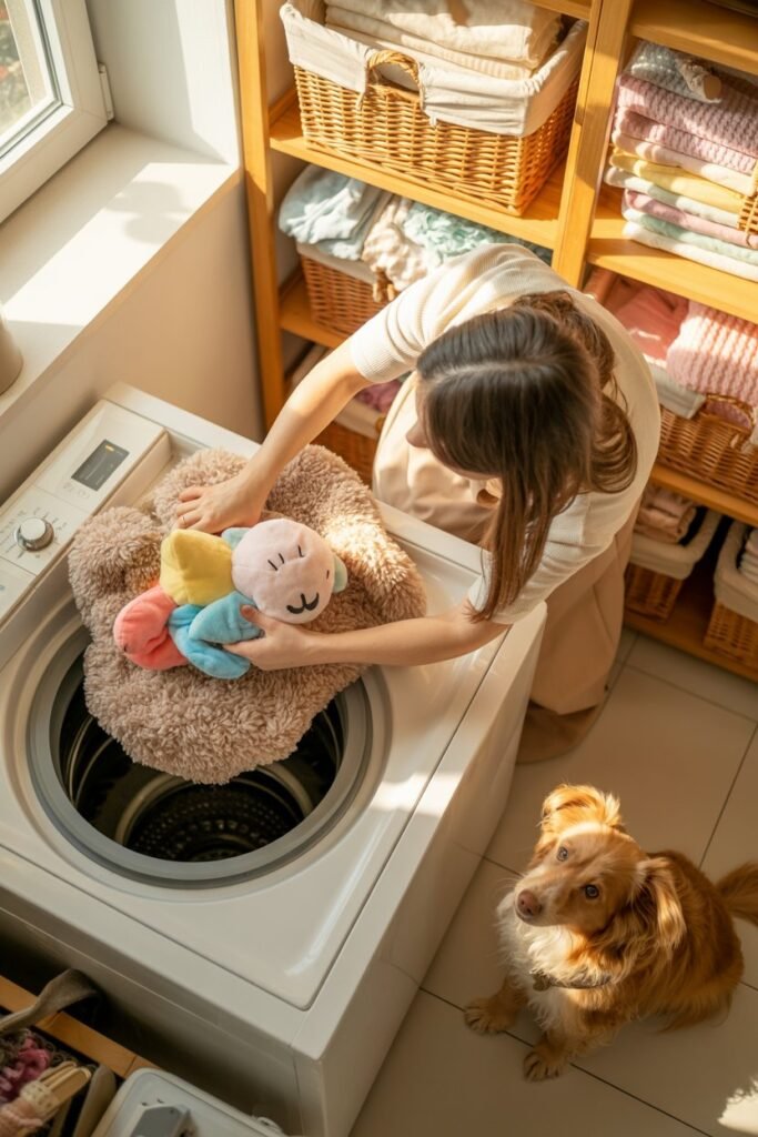 Pro Tip: “Add a cup of white vinegar to the wash cycle — it acts as a natural disinfectant and helps neutralize odors.”