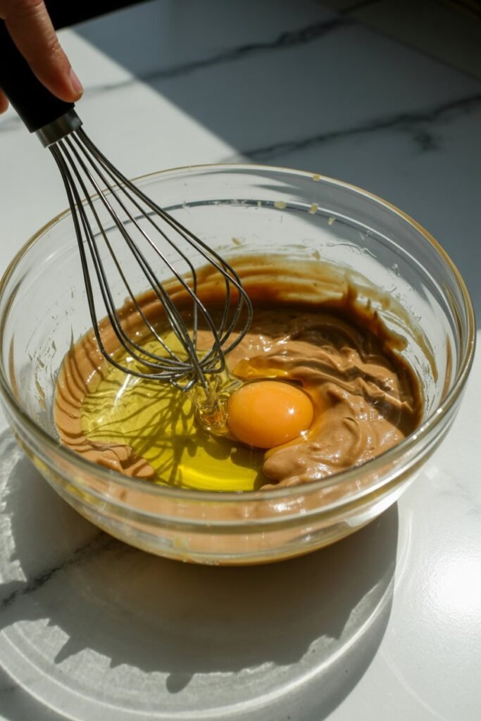 In a medium bowl, combine the peanut butter, egg, and olive oil. Whisk or stir until fully blended. The peanut butter should loosen up as it combines with the egg, creating a smooth, thick base.