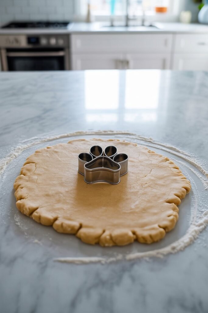 Lightly flour your countertop, then roll out the dough to about ¼ inch thick. Use a cookie cutter—paw, bone, or circle shapes work perfectly. Gather leftover dough, roll again, and repeat until all dough is used.