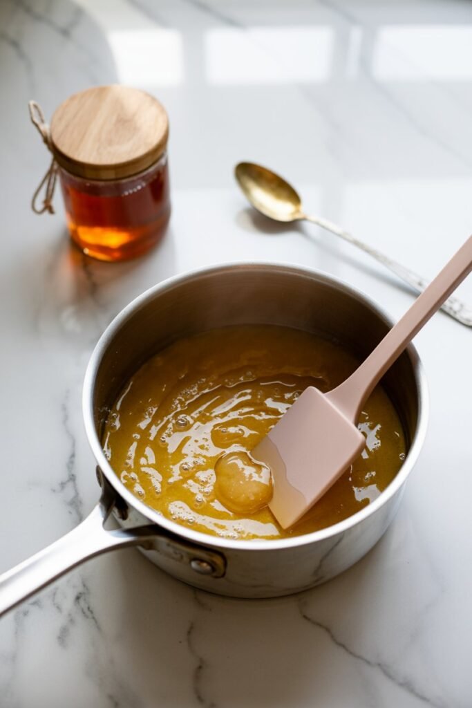 Do not boil — you want a smooth, clear mixture. Add the honey or purée (if using) and stir until fully blended.