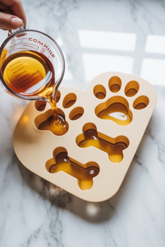 Carefully pour the warm mixture into silicone molds. Small paw or bone-shaped molds work perfectly.
