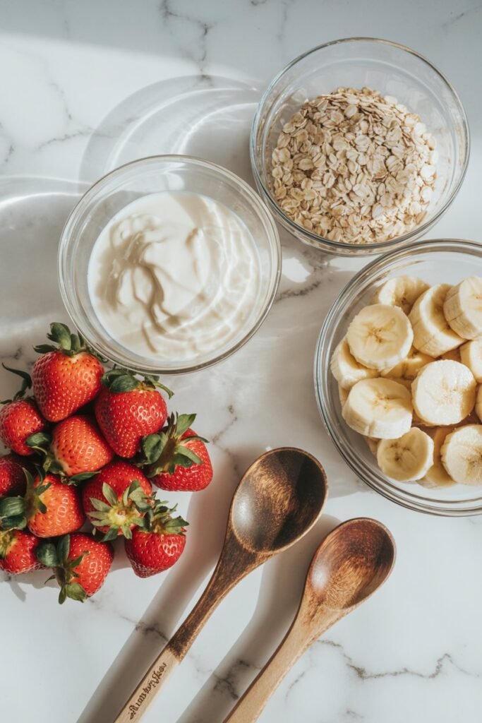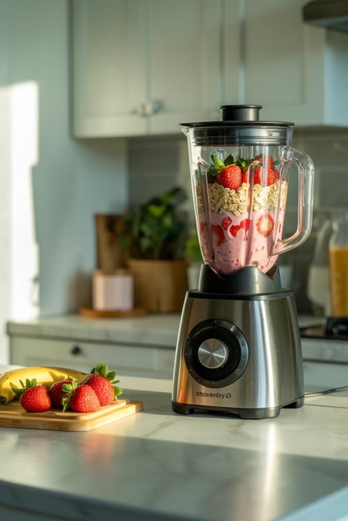 Place the strawberries, yogurt, oats, and banana in a blender. Add a small splash of water to help with blending.