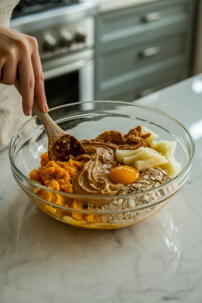In a mixing bowl, combine mashed sweet potato, oats, egg, applesauce, and peanut butter.