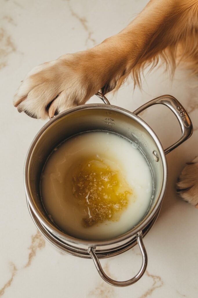 Once cooled, the balm will have a creamy, wax-like consistency — perfect for rubbing gently onto your dog’s paws.